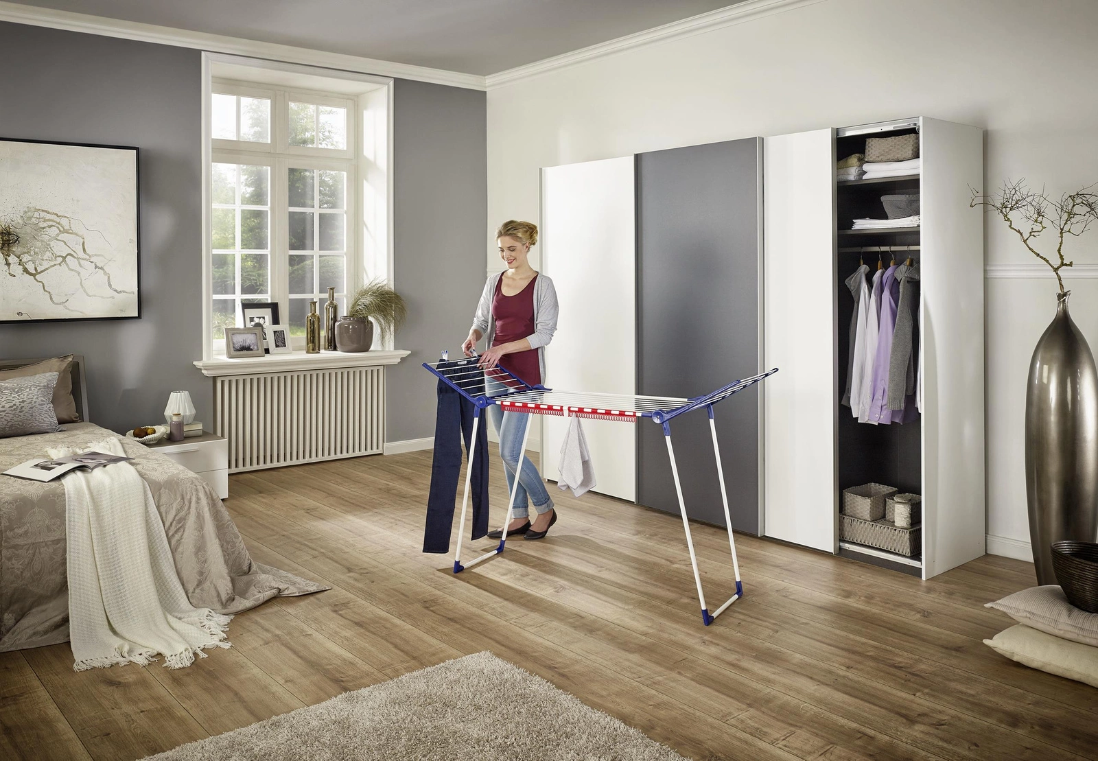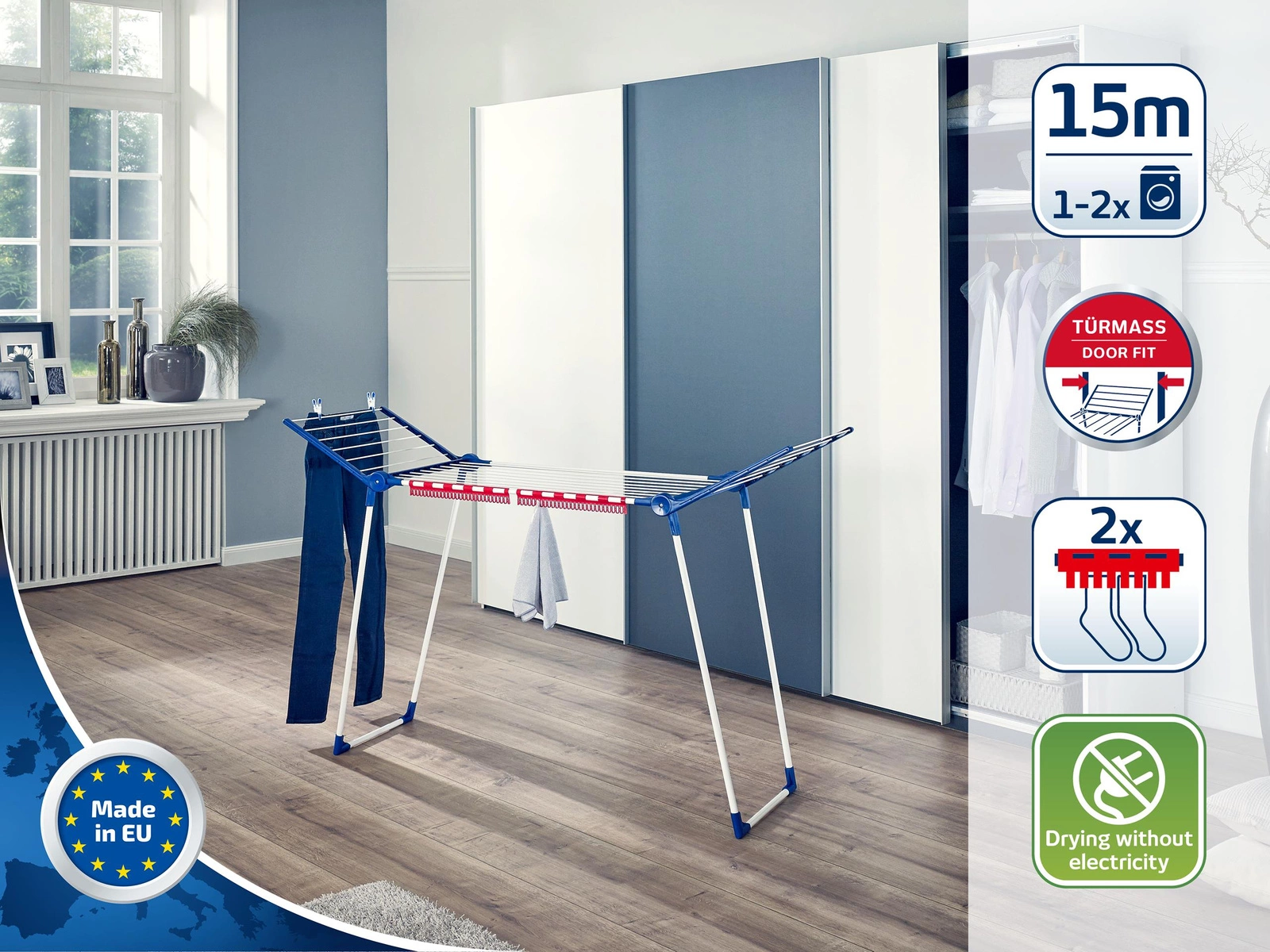 Rozkładane skrzydła o wysokości 105cm zapewniają wystarczająco dużo miejsca także na długie pranie, np. na spodnie i ręczniki.