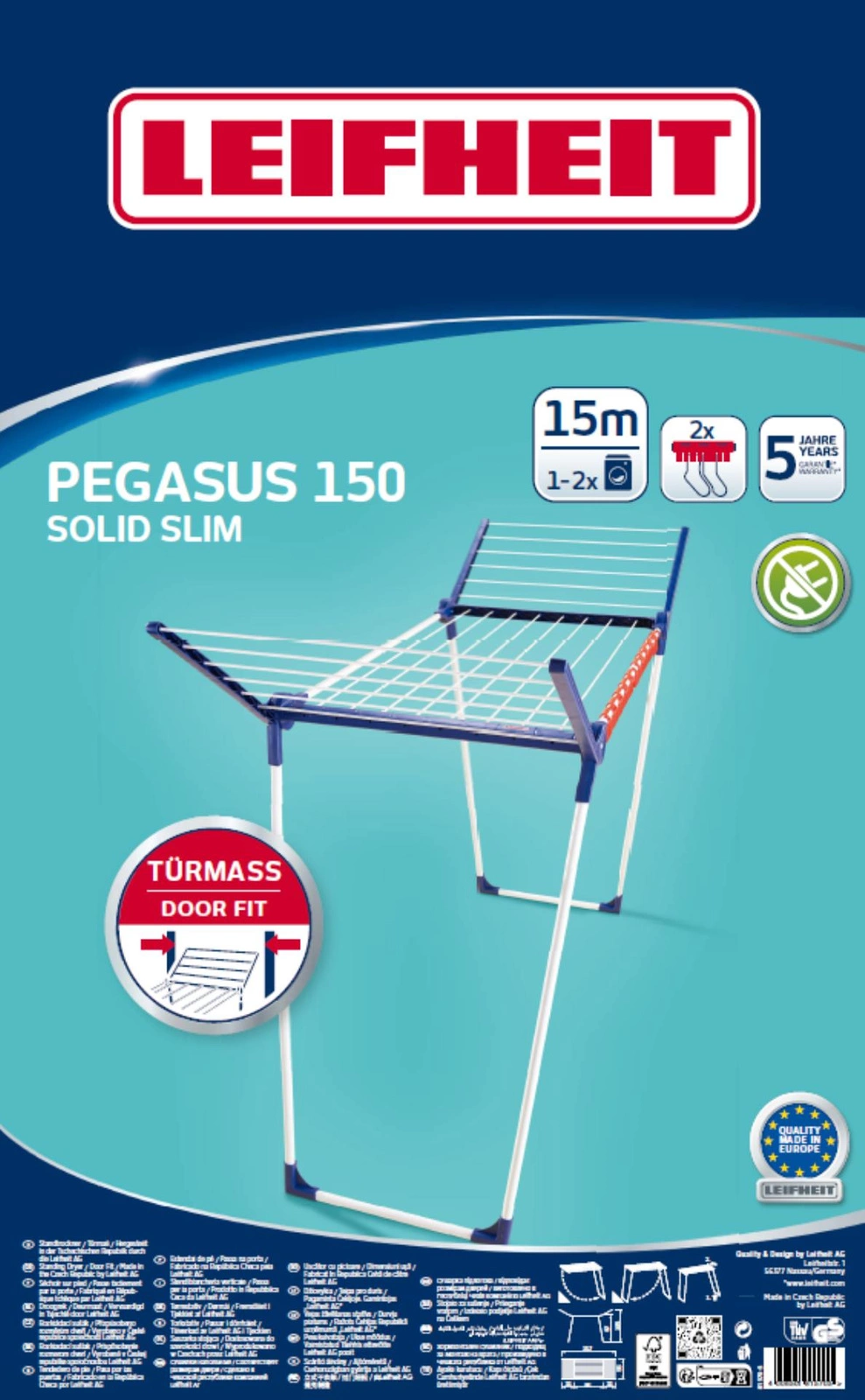 Dzięki dwóm rozkładanym skrzydłom całkowita długość suszarki Pegasus 150 wynosi 15 metrów. Ponieważ ma zaledwie 55 cm szerokości, również po rozłożeniu zmieści się w każdych drzwiach w mieszkaniu i na balkon. Obie równoległe, antypoślizgowe nóżki zapewniają stabilność i odporność na wiatr. Suszarka Pegasus 150 posiada dwa uchwyty na drobna garderobę. W pełni nierdzewna.