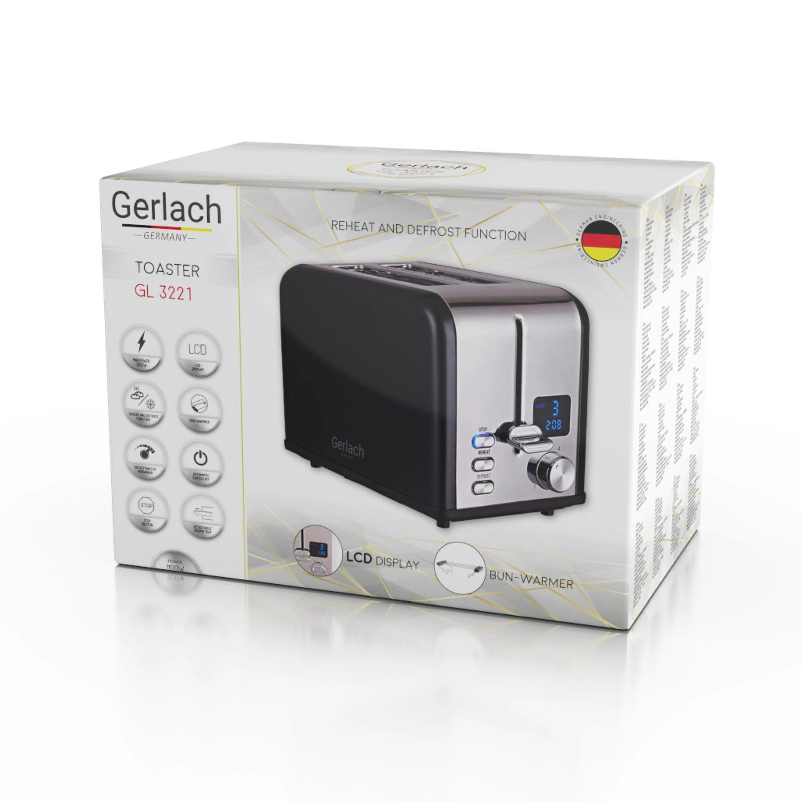 Toster z wyświetlaczem LCD, 6 poziomów opiekania, funkcje STOP/REHEAT/DEFROST, ruszt do bułek, Gerlach GL 3221b